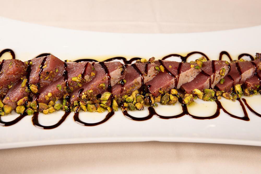2) Tagliata di tonno in crosta ai pistacchi di Bronte e mousse di balsamico